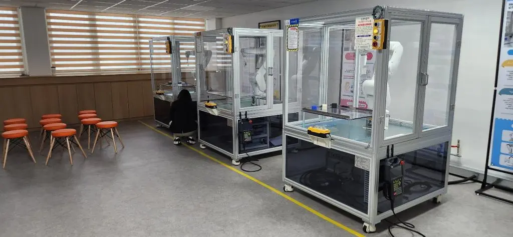 에이치씨엔씨는 현장 실무형 인재 양성을 위한 로봇 기반 스마트공장 실습 시스템(스마트배움터)을 구축 및 운영합니다.