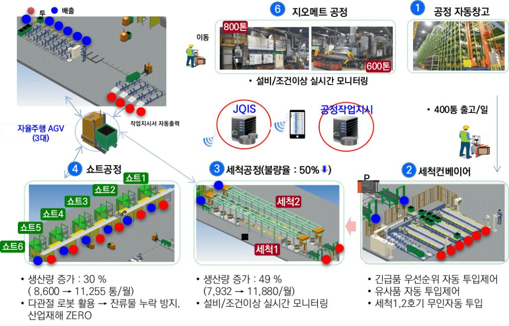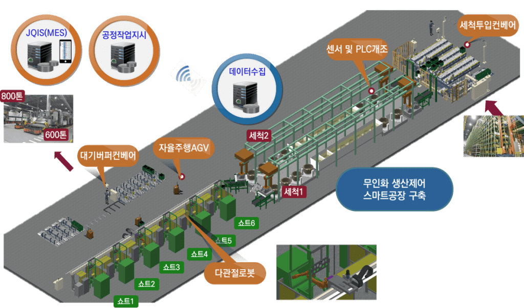 - 특징: 생산인원 80% 감소, 원소재 투입 ~ 완제품 배출까지 자동화